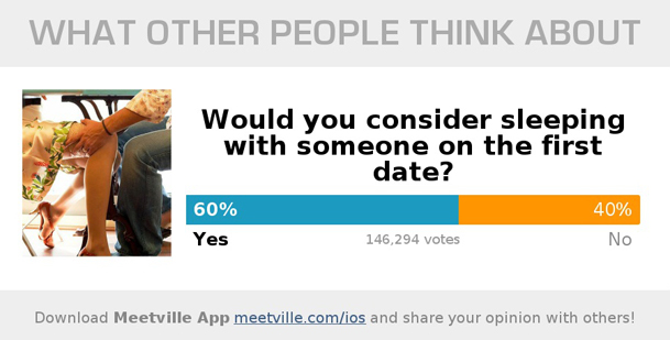 The poll measured people’s responses on the question: “Would you see sleeping with someone within the first date?” The results were as follows: “Yes” – 60%, “No” – 40%.