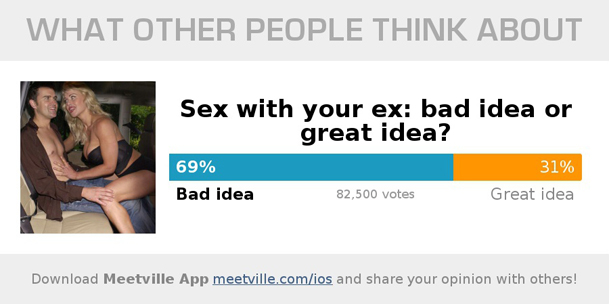 The poll measured people’s responses to the following question: “Sex along with your ex: bad idea or strategy?” An impressive 69% agree that ex-sex is definitely an awful idea.